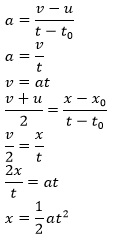 Note: a=acceleration, v=final velocity, u=initial velocity, t=final time, t0=initial time, x=total displacement, x0=initial displacement.